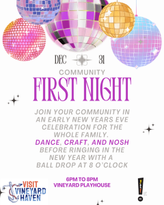 The 2025/26 New Year will mark 25 years since the last First Night event on Martha’s Vineyard. The Martha’s Vineyard Youth Task Force, in collaboration with Visit Vineyard Haven, is planning a First Night event for families from 6 to 8 pm on Dec. 31, and they are seeking nonprofits to participate. If you are interested and want to learn more, please reach out to Angela Knapp at aknapp@mvyouthtaskforce.org.